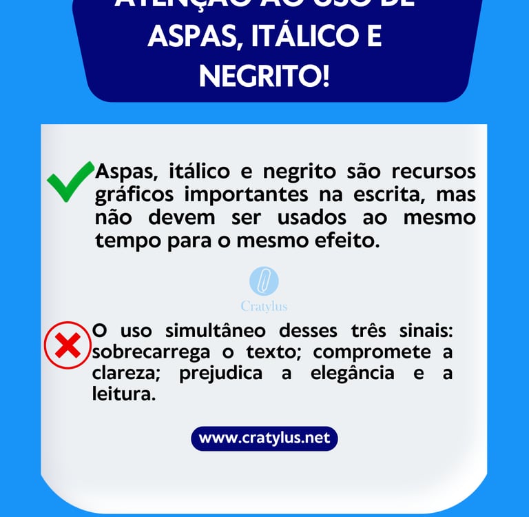 Aspas, itálico e negrito são três recursos gráficos amplamente utilizados na escrita para destacar informações, introduzir citações ou dar ênfase a determinados termos. No entanto, o seu uso exige critério, equilíbrio e coerência. Recomenda-se que o autor estabeleça um padrão uniforme de utilização, evitando o uso excessivo desses recursos para o mesmo tipo de conteúdo. O destaque indiscriminado pode comprometer a clareza, a elegância e a fluidez do texto.